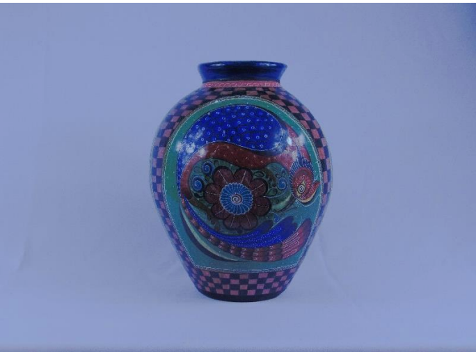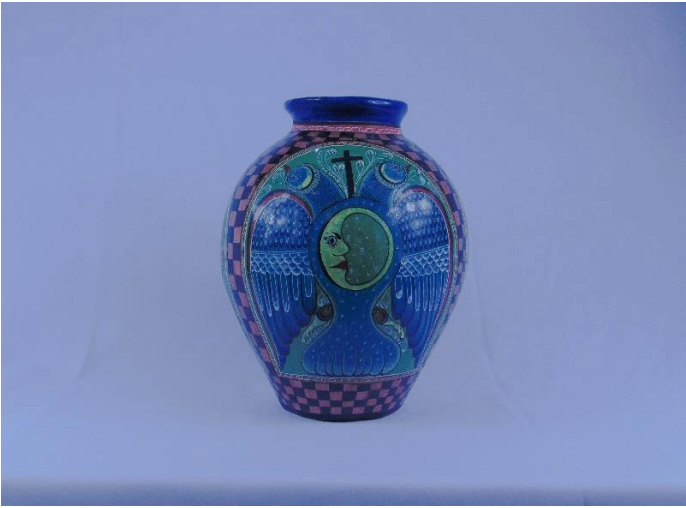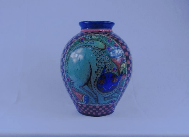 This burnished clay jar features three distinct scenes depicting Tonalá's traditional culture, including a two-headed eagle, an enigmatic bird, and the nagual.